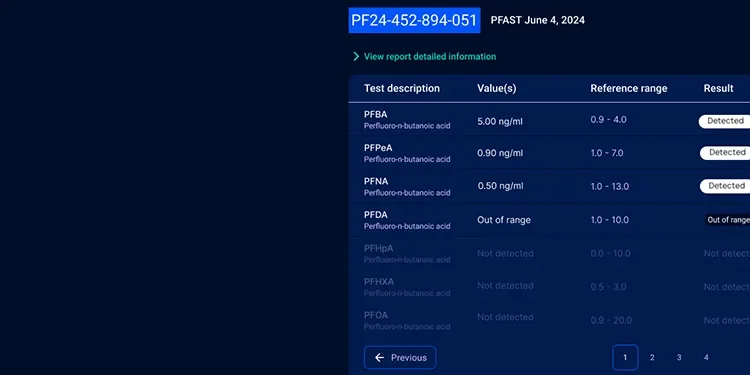 The Protean PFAS test tells you whether you have detectable levels of specific PFAS chemicals in your blood, as well as the concentration of each detected PFAS chemical in “ng/mL” (nanograms per milliliter). Each test includes a guide with recommendations on how to reduce PFAS exposure at home and in the workplace.*